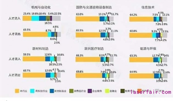 相對比其他類制造業(yè)來講,機(jī)械與自動化行業(yè)在吸引各界跨界人士方面有著很大的優(yōu)勢,剩余的其余5個行業(yè),他們的相互流入流出在數(shù)據(jù)上看是達(dá)到了相對的平衡。
