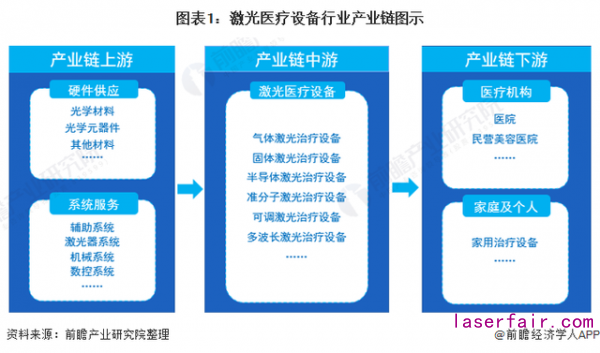 從產(chǎn)業(yè)鏈角度來(lái)看,激光醫(yī)療設(shè)備的產(chǎn)業(yè)鏈上游為硬件供應(yīng)商及系統(tǒng)服務(wù)商;中游為以激光器為核心的激光醫(yī)療設(shè)備生產(chǎn)廠家;下游為各類醫(yī)療機(jī)構(gòu)、家庭及個(gè)人。目前激光醫(yī)療器械在醫(yī)院、民營(yíng)美容醫(yī)院運(yùn)用最為廣泛,隨著激光設(shè)備智能化、小型化和環(huán)?;陌l(fā)展趨勢(shì),激光醫(yī)療未來(lái)有望惠及更多家庭及個(gè)人。