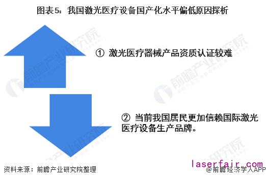 據(jù)2020年3月27日由中國(guó)科學(xué)院武漢文獻(xiàn)情報(bào)中心主導(dǎo)《2020中國(guó)激光產(chǎn)業(yè)發(fā)展報(bào)告》在線發(fā)布會(huì)顯示,目前我國(guó)激光醫(yī)療設(shè)備市場(chǎng)的發(fā)展仍不及預(yù)期,市場(chǎng)增速仍較緩。同時(shí),從國(guó)產(chǎn)化程度來(lái)看,目前我國(guó)國(guó)產(chǎn)化水平仍然偏低,雖然我國(guó)部分國(guó)產(chǎn)化設(shè)備已經(jīng)進(jìn)入部分醫(yī)療機(jī)構(gòu)及美容機(jī)構(gòu),但在我國(guó)三甲以上醫(yī)院中,激光醫(yī)療器械仍多采用進(jìn)口,主要是由于一是激光醫(yī)療器械產(chǎn)品資質(zhì)認(rèn)證較難,二是當(dāng)前我國(guó)居民更加信賴國(guó)際激光醫(yī)療設(shè)備生產(chǎn)品牌。