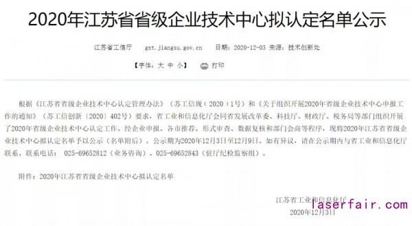 “2020年江蘇省省級企業(yè)技術(shù)中心擬認定名單”公布,天弘激光上榜