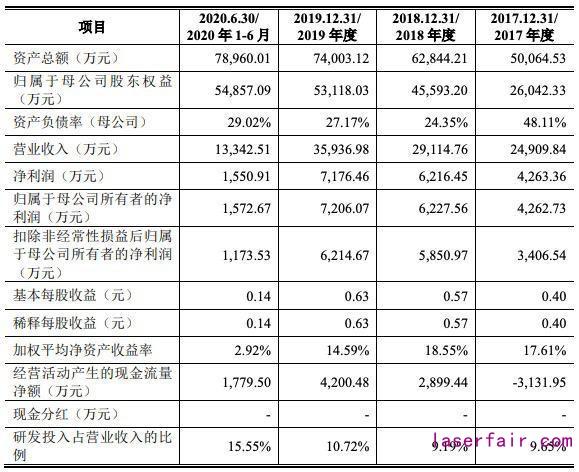 2017年-2020年上半年英諾激光的營業(yè)收入分別為2.49億元、2.91億元、3.59億元和1.33億元,其同比增長率分別為67.58%、16.88%、23.43%和-11.42%;同期凈利潤分別為4263.36萬元、6216.45萬元、7176.46萬元和1550.91萬元,其同比增長率分別為1356.15%、45.81%、15.44%和0.76%。