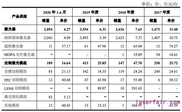 招股書顯示,英諾激光的激光器業(yè)務(wù)以銷售納秒固體激光器和超快激光器為主,2017-2020年上半年,上述兩類激光器的銷售收入占該公司激光器銷售收入的比例分別為94.7%、99.9%、100%和100%。其中納秒固體激光器銷售金額分別為1.51億元、1.93億元、1.95億元和0.84億元,占激光器銷售總收入的比例分別為89.43%、96.14%、86.96%和95.34%,是英諾激光的核心主導(dǎo)產(chǎn)品。