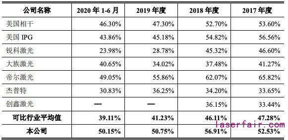 招股書顯示,2017年至2020年6月,英諾激光的綜合毛利率分別為52.53%、56.91%、50.75%和50.15%,可比同行的毛利率均值分別為47.28%、46.11%、41.23%和39.11%。英諾激光綜合毛利率高于行業(yè)均值,但存下滑趨勢。