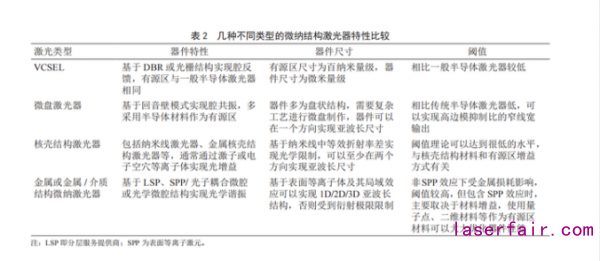 最早的結(jié)構(gòu)微小化半導(dǎo)體激光器是垂直腔面發(fā)射激光器,將激光器的尺寸降低到了幾十微米量級(jí),并在通信、電子消費(fèi)等領(lǐng)域獲得了廣泛的應(yīng)用。由于尺寸的降低往往代表著閾值和功耗的降低,在過(guò)去的 50 年中,半導(dǎo)體激光器的體積已經(jīng)減少了大約 5 個(gè)數(shù)量級(jí)。為了進(jìn)一步減小體積獲得更高的性能,人們嘗試了各種方法來(lái)進(jìn)行腔長(zhǎng)的壓縮和諧振腔的設(shè)計(jì),如使用回音壁模式的微盤激光器、使用金屬核殼結(jié)構(gòu)的等離子激元激光器、基于法布里 –波羅腔的異質(zhì)結(jié)二維材料激光器等。表 2 介紹了幾種不同類型的微納激光器特性比較。通過(guò)光學(xué)、表面等離子、二維材料等新興科學(xué)技術(shù)的引入,微納激光器目前已經(jīng)實(shí)現(xiàn)了三維尺寸衍射極限的突破?;诒砻娴入x子激元介電模式的 SPASER 激光器,橫向尺度可以做到 260 nm 以下