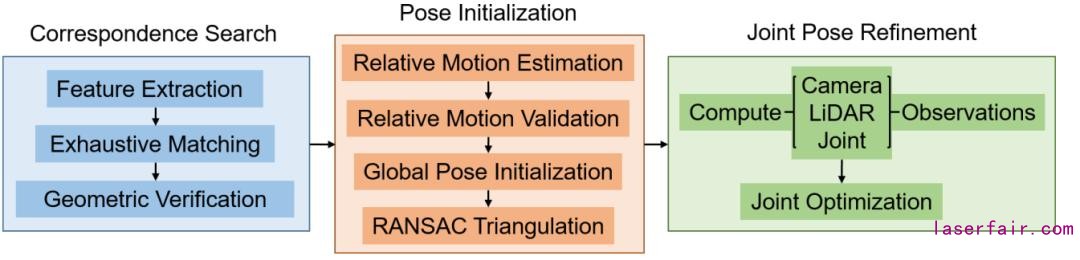 該方案以一組立體圖像和相關(guān)的LiDAR點(diǎn)云作為輸入,以三角化特征點(diǎn)和合并的LiDAR點(diǎn)云的格式生成覆蓋環(huán)境的三維模型。下圖顯示了我們的LiDAR增強(qiáng)SfM方案的過程光雷達(dá)增強(qiáng)的雙目SFM方案