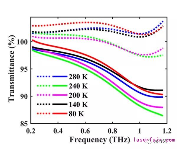 圖2.不同溫度下,紅色(虛線)和藍(lán)色(實(shí)線)熒光碳量子點(diǎn)的THz透射率