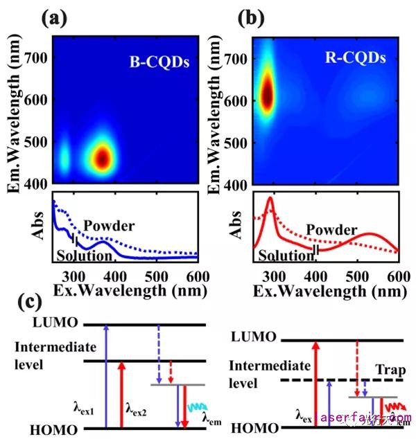 圖1.(a)兩種碳量子點(diǎn)的光致發(fā)光光譜;(b)兩種碳量子點(diǎn)的紫外-可見(jiàn)吸收光譜;(c)電子能級(jí)和光致發(fā)光電子躍遷示意圖