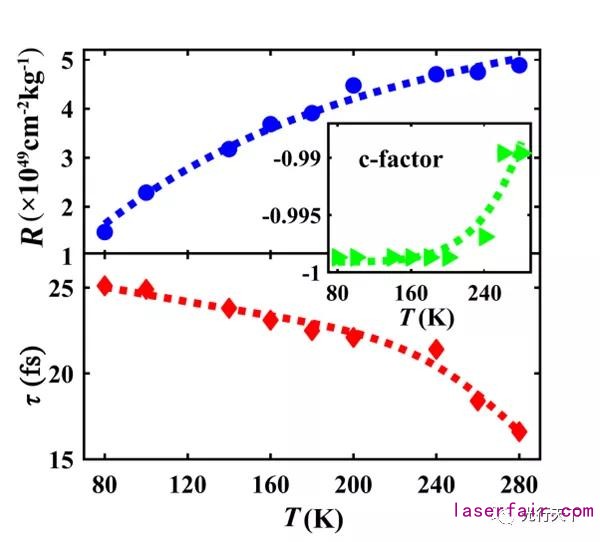 圖3.藍(lán)色碳量子點(diǎn)的載流子濃度相關(guān)參數(shù)R、馳豫時(shí)間τ及局域化因子c隨溫度變化的實(shí)驗(yàn)數(shù)據(jù)(點(diǎn))及其擬合曲線(虛線)