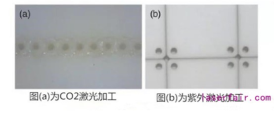 根據(jù)陶瓷對(duì)激光的吸收屬性,以及電子陶瓷元器件的逐漸小型化,CO2激光、綠光加工陶瓷都難以達(dá)到要求,只有紫外激光能實(shí)現(xiàn)陶瓷精細(xì)加工,包括陶瓷的標(biāo)刻、切割、打孔。CO2激光與紫外激光在陶瓷材料加工實(shí)際效果對(duì)比: