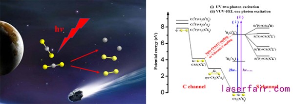 星際空間硫化物的產(chǎn)生與演化是重要的研究課題。20世紀80年代,國際紫外線探測器人造衛(wèi)星(IUE satellite)陸續(xù)在多顆彗星上觀測到了CS、S2分子,而其母體分子CS2由于沒有永久偶極矩,在很長一段時間內(nèi)未被觀測到。目前,普遍認為,CS2是慧核、星際塵?;虮酥写嬖诘臍怏w分子,而CS和S2是CS2光解產(chǎn)生的,但CS2主要的解離機理并不十分清楚,S2尚未被實驗直接觀測到。因此,CS2的光解研究有助于人們進一步了解彗星及星際塵埃的物質(zhì)組成及其相互演化過程。