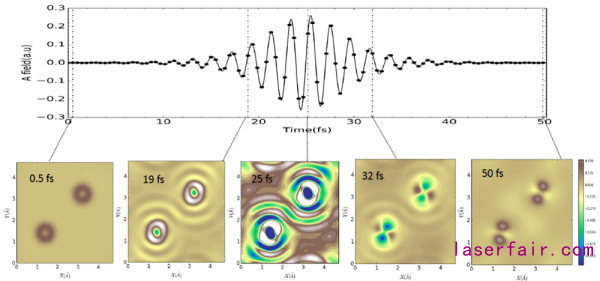 圖2.激光輻照下MgF2晶體中的電子動力學(xué)。上圖為激光場的波形,下圖為不同時刻電子密度分布的變化