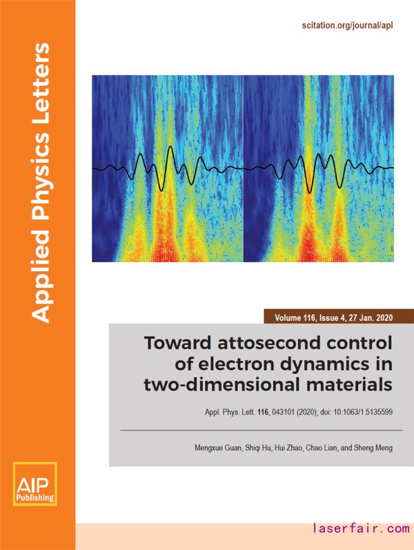 圖4.Appl. Phys. Lett.封面。圖中展示的是二維固體在相位差分別為π/2和π的雙激光脈沖下(黑線)的輻射譜隨時間的變化