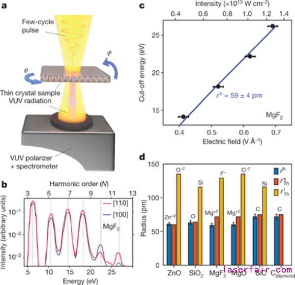 圖1.固體價電子的激光顯微照相術(shù)。(a)是實驗裝置圖,(b)是MgF2晶體的高次諧波譜,(c)是高次諧波截止頻率與激光場的關(guān)系,其斜率即對應(yīng)于體系中的最小離子半徑,(d)探測到的不同原子或離子的半徑(藍色)和經(jīng)驗值(紅色、黃色)的比較