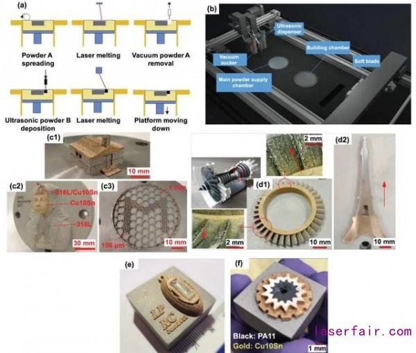 圖1(a) 曼徹斯特大學(xué)所發(fā)展的以SLM為基礎(chǔ)的多材料打印的示意圖; (b)相關(guān)的實(shí)驗(yàn)裝置的示意圖 , (c1)–(c3)SLM技術(shù)制造的 316 l-Cu10Sn 樣品, (d1) 316 L-Cu10Sn功能梯度的渦輪盤樣品 ;(d2) 埃菲爾鐵塔樣品, (e) Cu10Sn-玻璃吊墜樣品, (f ) Cu10Sn-PA11 樣品.