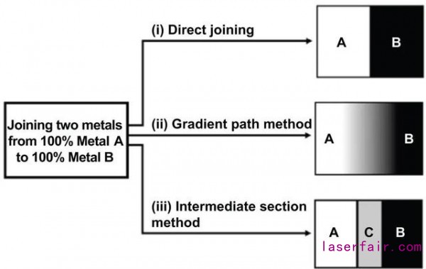同傳統(tǒng)的LSM技術(shù)打印單一材料相比較,在多元材料的SLM制造過程中,異種材料的連接是一個非常重要的話題.正如焊接異種材料一樣,其工藝過程顯著的影響著整個部件的性能.對于不同的材料組合,其相容性,可混合性以及材料的熱性能都是在設(shè)計階段需要考慮的問題.為了在SLM過程中實(shí)現(xiàn)多元材料獲得理想的機(jī)械性能和冶金性能的接頭,研究人員研究了不同的連接策略,包括直接連接,功能梯度連接和界面處過渡層連接等手段,如圖2所示.早先的研究使用了不同的金屬組合來進(jìn)行多元材料的連接.