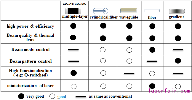 相對于單晶鍵合技術(shù),透明激光陶瓷能夠采用高溫?zé)Y(jié)技術(shù),通過熱擴散方式消除鍵合面之間的縫隙,其在鍵合強度方面遠高于鍵合單晶介質(zhì),在固體激光應(yīng)用方面潛力巨大。目前,復(fù)合結(jié)構(gòu)透明陶瓷已經(jīng)成為固體激光增益介質(zhì)的主要發(fā)展方向之一。表1展示了不同結(jié)構(gòu)的復(fù)合型Nd: YAG陶瓷的激光輸出特性,也充分體現(xiàn)出復(fù)合結(jié)構(gòu)透明陶瓷作為激光增益介質(zhì)的優(yōu)勢。