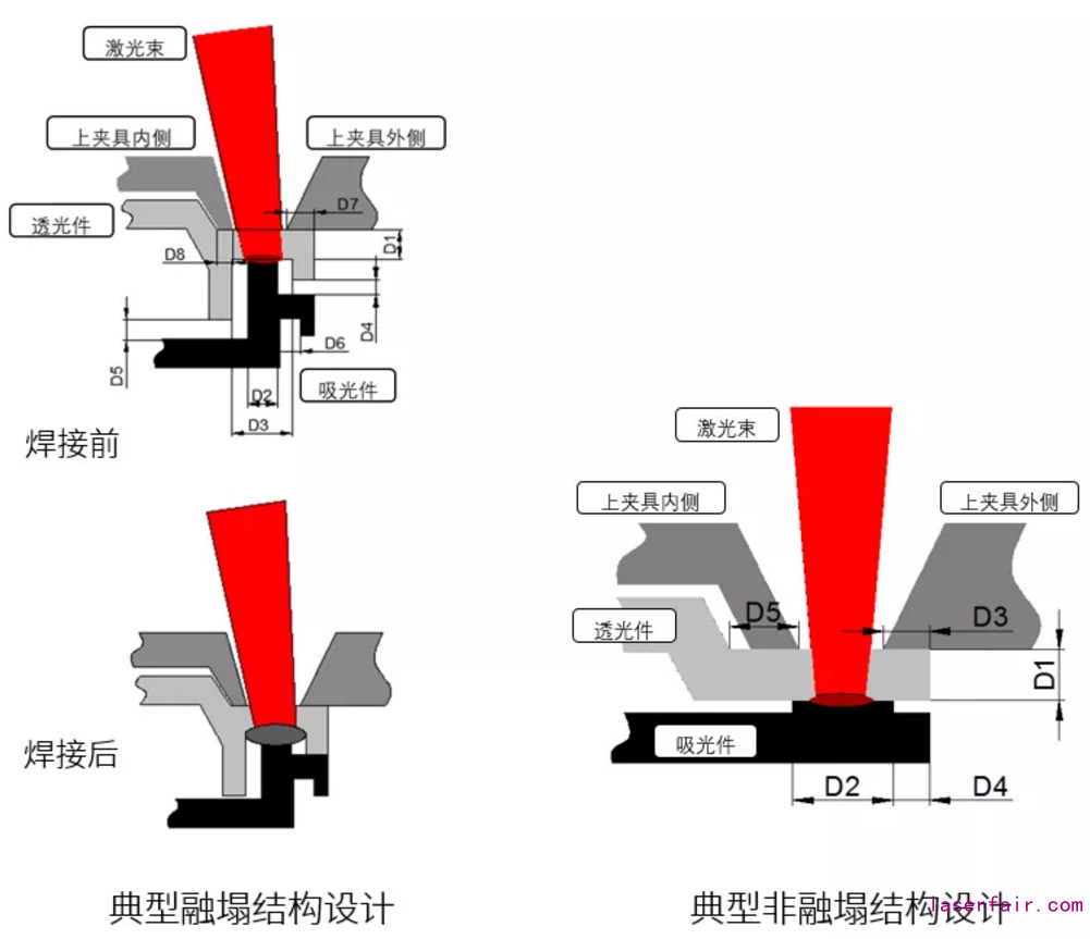 激光焊接大致可以分為兩種結(jié)構(gòu)設(shè)計,融塌結(jié)構(gòu)設(shè)計以及非融塌結(jié)構(gòu)設(shè)計。什么是融塌呢?我們可以通過下面這張動圖直觀地了解一下: