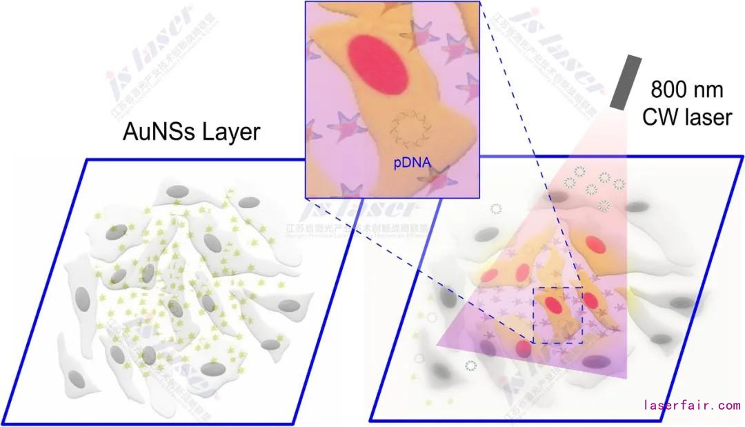 圖4 一個以AuNS層為介導(dǎo)的等離子體光穿孔平臺在激光輻照的前提下用于生物分子的輸送輸送至粘附細(xì)胞