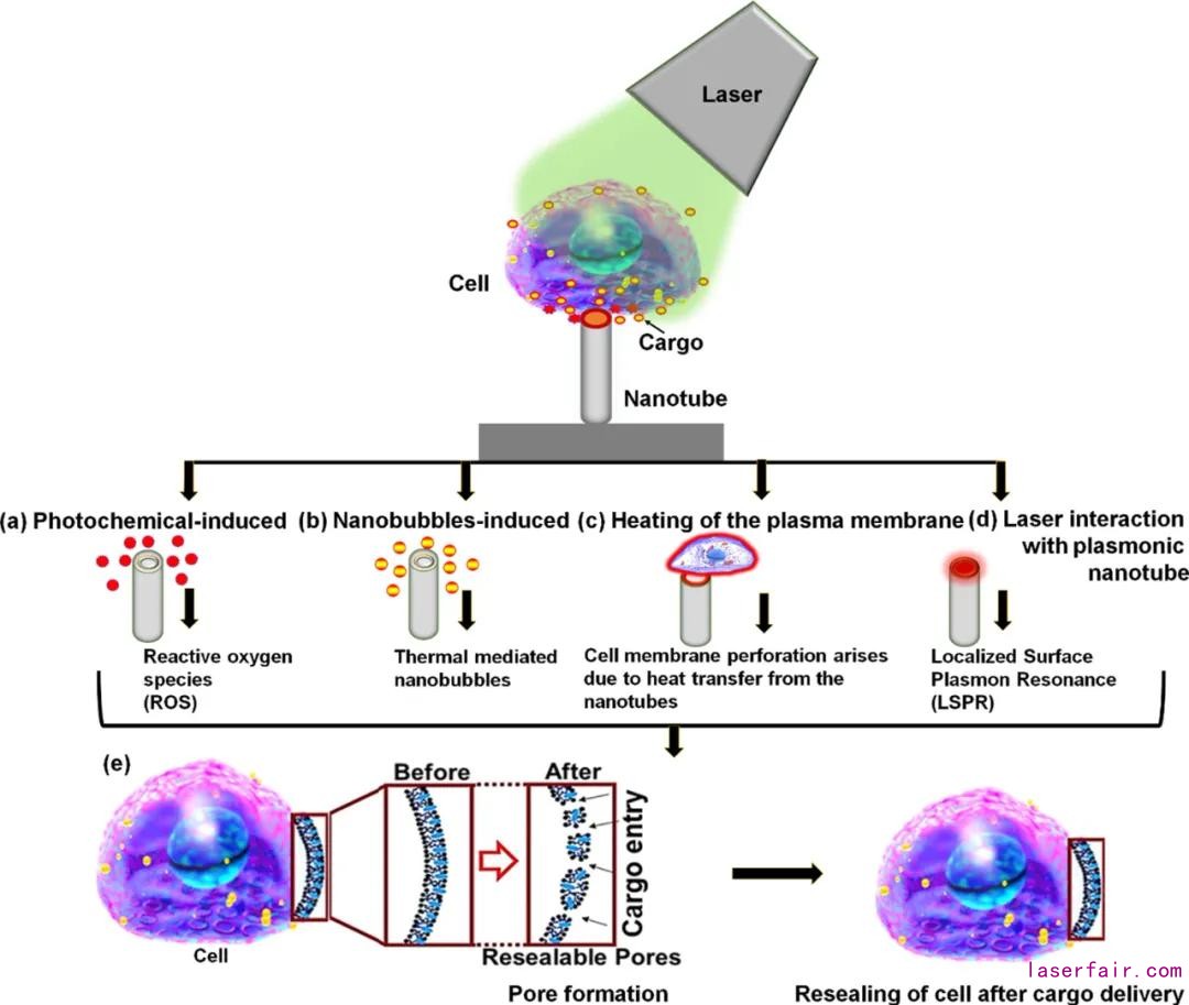 細(xì)胞膜穿孔的可能的機(jī)理包括:熱介導(dǎo)納米氣泡,光化學(xué)誘導(dǎo)活性氧,自納米管到細(xì)胞膜的熱傳遞,在這一納米管局部表面等離子體共振強(qiáng)電磁場等.這就導(dǎo)致在每一個細(xì)胞膜-納米管的界面上空化納米氣泡的形成,將會快速的生長,合并和坍塌,從而導(dǎo)致爆炸,導(dǎo)致細(xì)胞膜的穿孔,這促進(jìn)生物分子自細(xì)胞外部到細(xì)胞內(nèi)部進(jìn)行輸送.這一在二氧化鈦納米管為基礎(chǔ)的輔助光穿孔的細(xì)胞間的輸送的精準(zhǔn)的機(jī)理仍然不清楚.細(xì)胞間的輸送也許是幾個不同機(jī)理的混合效應(yīng),豐橋技術(shù)科學(xué)大學(xué)的L. Mohan說到.