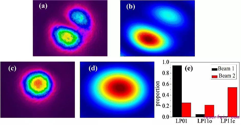 在本項工作中,研究人員首先對主放大器的增益光纖進行盤繞限模優(yōu)化,增加除LP01和LP11以外的高階模的損耗,實現(xiàn)1.4 kW窄線寬少模激光輸出。然后,以高功率光纖激光器輸出的LP01和LP11模式的強度分布特征為基礎(chǔ),通過探測光斑的中心光強變化作為系統(tǒng)的評價函數(shù),以區(qū)分不同的模式。利用高速可編程門陣列(FPGA)來實現(xiàn)SPGA算法,產(chǎn)生4路反饋控制電壓信號,并將其加載到模式控制器之上。模式控制器中的壓電陶瓷(PZT)對預放光纖產(chǎn)生擠壓和應力,改變光纖中各種橫向模式的配比。當這些模式注入到主放大器,利用放大器的模式競爭特性,實現(xiàn)不同橫模模式的受控功率放大。當SPGD算法收斂到最大值時,激光器輸出LP01模式激光;當SPGD算法收斂到最小值時,激光器輸出LP11模式激光。通過對紅外相機采集到的光強分布進行模式解構(gòu)處理,得出兩種情況下產(chǎn)生的LP01模式的光光效率為84.1%,LP11模式的光光效率為85.8%以上,兩種模式切換的轉(zhuǎn)換效率大于99.5%。本實驗產(chǎn)生的1.4 kW的橫模可控光纖激光,在光鑷技術(shù)、原子捕獲、激光微加工等領(lǐng)域有重要的應用價值。此外,寬帶寬的主動模式控制系統(tǒng)也對以后開展光纖激光器模式不穩(wěn)定的研究提供了有利條件。