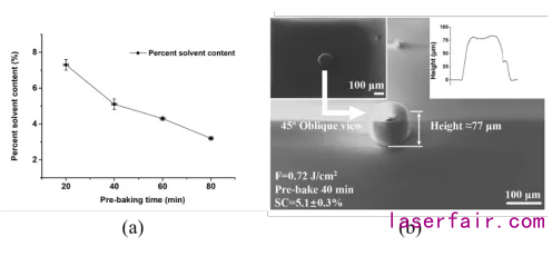 圖1 (a)增加預(yù)烘烤時(shí)間以降低SU-8中的溶劑含量(b)長焦距、單脈沖曝光的扁平化MPP產(chǎn)物的正、側(cè)視圖及其高度信息