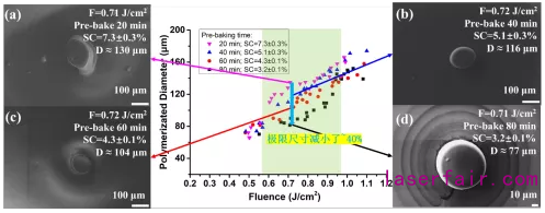 通過烘烤改變光引發(fā)劑的濃度,研究光引發(fā)劑在光刻膠中擴(kuò)散行為對(duì)最終聚合極限尺寸的影響規(guī)律。利用長焦距、單次飛秒脈沖曝光方法獲得了扁平化聚合物,精確表征了聚合物尺寸,發(fā)現(xiàn)當(dāng)SU-8膠膜的溶劑含量從~7%下降到4%時(shí),MPP產(chǎn)物的尺寸減小了~40%。