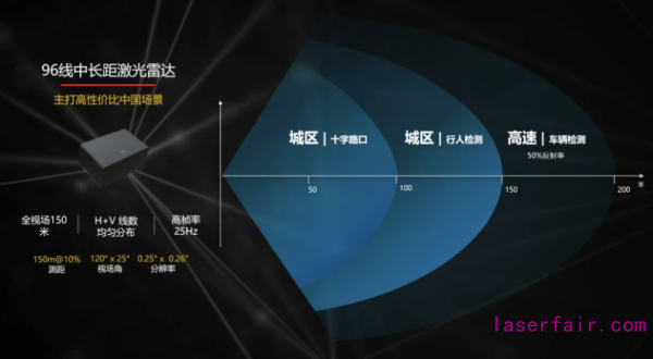 華為2020年12月21日發(fā)布的MEMS混合固態(tài)激光雷達(dá),采用905nm激光器,分辨率為96線,擁有全視場景150米的測距能力,大視野120°x 25°,滿足城區(qū)、高速等場景的人、車測距需求;全視野中,水平、垂直線束均勻分布,不存在拼接、抖動等情況,形成穩(wěn)定的點(diǎn)云對后端感知算法友好;小體積,滿足前裝量產(chǎn)車型需求。