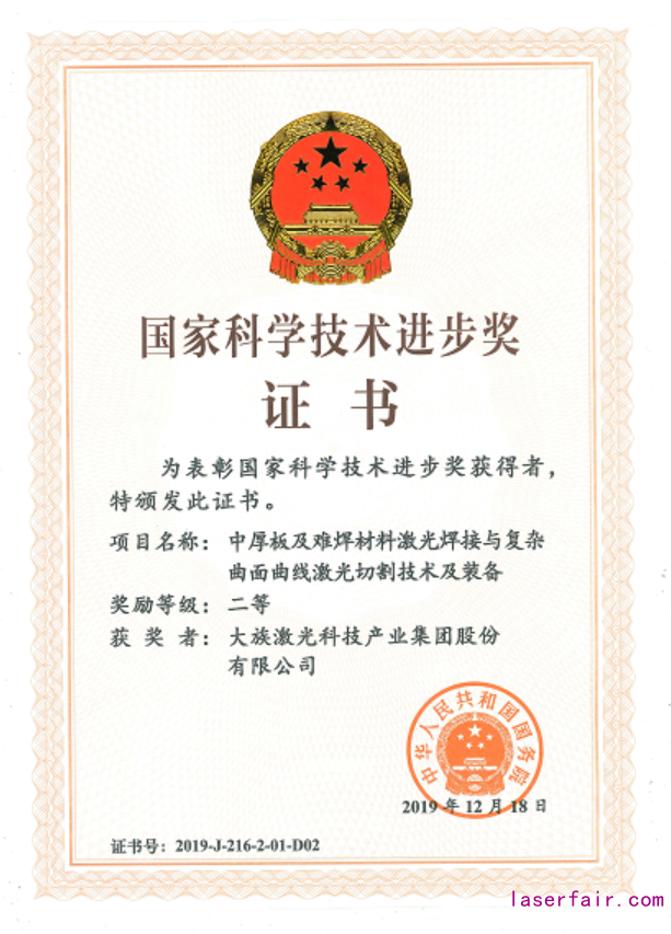 2019年,大族激光智能裝備集團(tuán)“中厚板及難焊材料激光焊接與復(fù)雜曲面曲線激光切割技術(shù)及裝備”項(xiàng)目榮獲科技界最高獎(jiǎng)“國(guó)家科學(xué)技術(shù)進(jìn)步獎(jiǎng)”;代表國(guó)際領(lǐng)先水平的三維五軸激光加工裝備獲得“中國(guó)好設(shè)計(jì)獎(jiǎng)”。