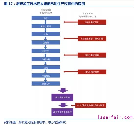 電價(jià)下降趨勢壓力下,高效太陽能電池產(chǎn)品的使用為激光加工設(shè)備帶來發(fā)展機(jī)遇。光伏行業(yè)發(fā)展迅速帶來機(jī)遇,但同時(shí)競價(jià)上網(wǎng)政策加大了企業(yè)競爭壓力。因此,光伏發(fā)電企業(yè)紛紛通過使用更加高效的電池組件來降低發(fā)電成本,PERC、SE、MWT 電池等工藝技術(shù)能夠顯著提升電池發(fā)電效率、為光伏電站及電池廠商帶來可觀收益,應(yīng)用得到推廣。而在電池及組件的生產(chǎn)過程中,激光消融(刻蝕)、激光摻雜、激光打孔及激光劃片/裂片工藝,具備工藝流程簡單、投入成本低、制作效率高等多重優(yōu)勢,有效控制了生產(chǎn)過程中的光學(xué)損失和電學(xué)損失,對于太陽能電池光電轉(zhuǎn)換效率提升具有重要作用。