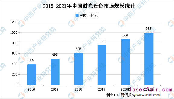 目前,我國(guó)已成為全球制造業(yè)第一大國(guó),國(guó)內(nèi)市場(chǎng)對(duì)激光技術(shù)產(chǎn)品的需求日益旺盛。2010年以來,得益于激光加工應(yīng)用市場(chǎng)的不斷拓展,我國(guó)激光產(chǎn)業(yè)也逐漸駛?cè)敫咚侔l(fā)展期。2018年中國(guó)激光設(shè)備市場(chǎng)規(guī)模達(dá)到605億元,同比增長(zhǎng)22.22%,2011年至2018年復(fù)合增速達(dá)26.45%。中商產(chǎn)業(yè)研究院預(yù)測(cè),2021年我國(guó)激光設(shè)備市場(chǎng)規(guī)模將達(dá)988億元。