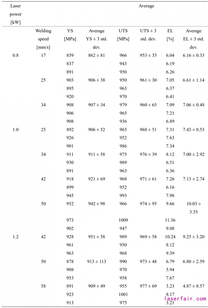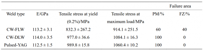 表4.1[14] 激光焊接Ti–6Al–4V的拉伸性能