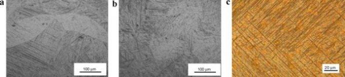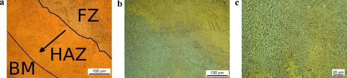 圖3.3[14] 1kW,50mm / s下的HAZ顯微組織。(a) HAZ的放大;箭頭指向從FZ相鄰的富含α'區(qū)域到BM附近的貧α'區(qū)域。(b)HAZ / BM界面(HAZ位于右側(cè))的微觀組織。(c)b的放大。