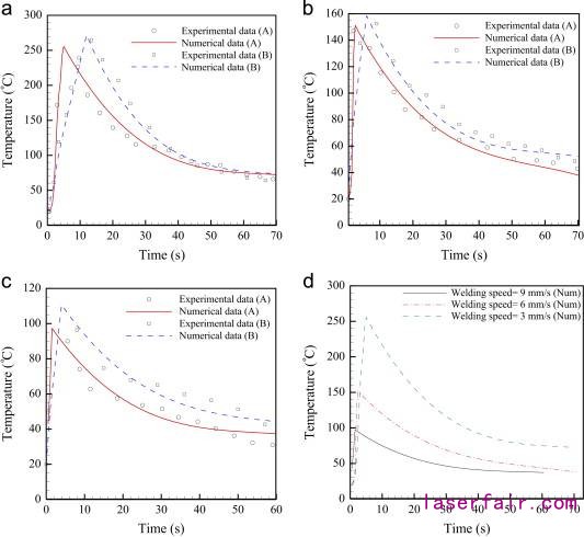 在每個(gè)焊接速度下,溫度分布在接近激光束中心處急劇減小,然后在離激光束中心的較遠(yuǎn)區(qū)域中略微減小。