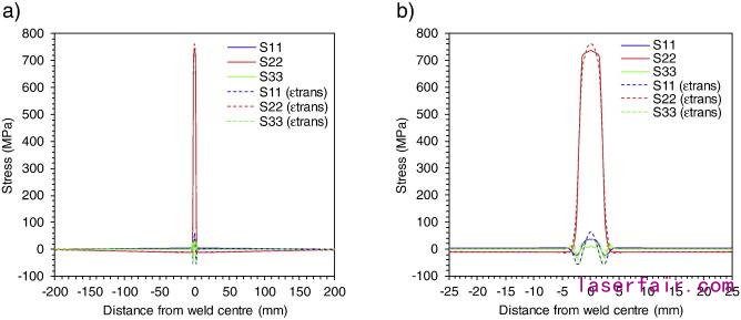 圖5.4[16] 殘余應(yīng)力分布:(a)在所有三個(gè)主要方向上,在焊縫附近的整個(gè)寬度上,(b)橫向(11),縱向(22)和具有及不具有相變的法線方向