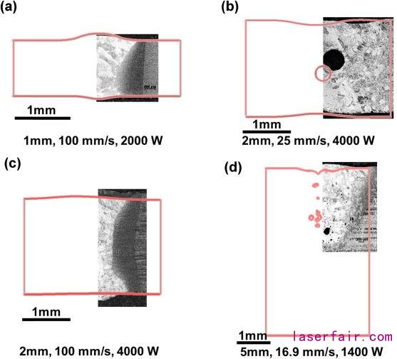 為了獲得可接受的焊接輪廓和令人滿意的機(jī)械性能,焊縫形狀的控制是必要的,因?yàn)楹缚p的機(jī)械性能受焊縫形狀的影響。影響焊接金屬凝固行為的焊縫形狀受焊接參數(shù)和輸入工件的相應(yīng)熱量[11]的影響。因此,有必要理解包括激光功率,焊接速度和散焦距離[12]在內(nèi)的焊接參數(shù)對(duì)焊縫形態(tài)的影響以及確定焊接缺陷的來源。然后可以確定焊接參數(shù)的最佳組合,確保所需的焊接質(zhì)量和性能,并且最小化焊接缺陷[13]。