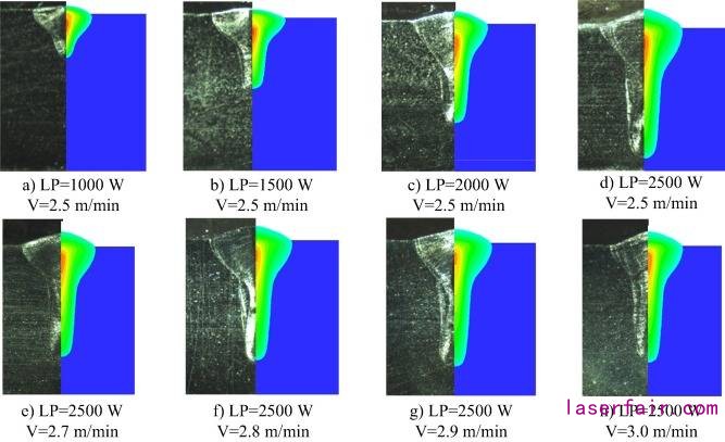 隨著焊接速度的增加,溫度下降,并預(yù)測在較小的溫度下,熔池有較小的寬度。熔池的寬度隨焊接速度的增加而降低,且模擬結(jié)果與實(shí)驗(yàn)一致。熔池的深度隨著焊接速度的增加而降低。在功率恒定的情況下,焊接速度的增加導(dǎo)致加熱時(shí)間過短,不足以產(chǎn)生顯著的熔池深度。在高焊接速度下,模擬結(jié)果與實(shí)驗(yàn)數(shù)據(jù)一致。由于在較低速度下,光束在匙孔內(nèi)多次反射,吸收率增加,模擬略微不同于實(shí)驗(yàn)。熱影響區(qū)隨著焊接速度的增加而減小。