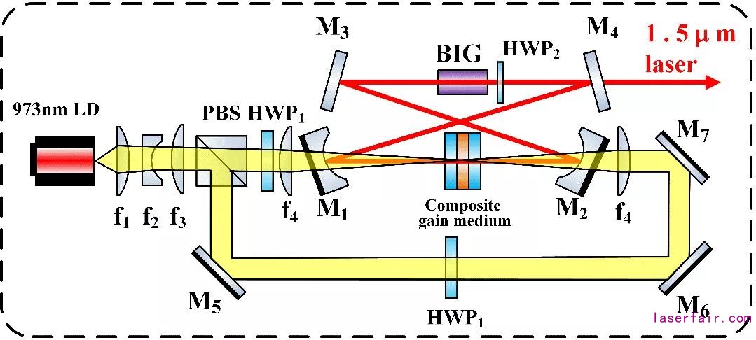 激光器結構如圖1所示,包括973 nm激光二極管(LD)、泵浦整形系統(tǒng)(f1、f2、f3、f4)、泵浦分束器(PBS、HWP1)、藍寶石-Er,Yb:YAB-藍寶石薄片(Composite gain medium)、光學單向器(BIG、HWP2)、諧振腔鏡(M1、M2、M3、M4)。所用Er,Yb:YAB晶體沿a 軸切割,Er離子摻雜濃度為1.1 at.%,Yb離子摻雜濃度為25 at.%,晶體長度為2 mm。