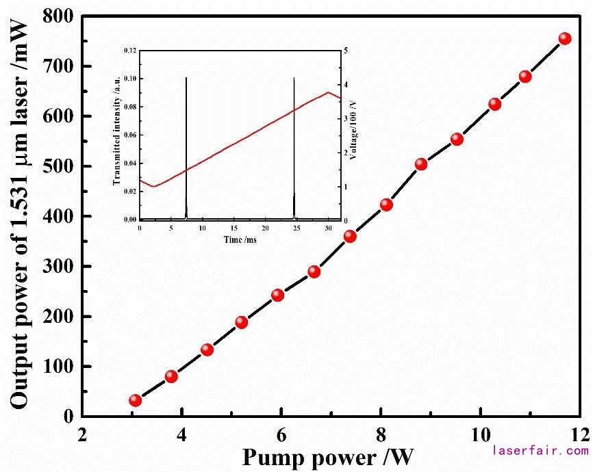 2013年,山西大學的李淵驥等報道了基于雙標準具選模技術的400 mW連續(xù)波單頻1.55 μm激光器。2019年,山西大學的朱海瑞等報道了基于扭擺模腔選模技術的連續(xù)波單頻可調(diào)諧1.542 μm激光器,最高輸出功率可達420 mW。本次報道的基于單向行波環(huán)形腔選模技術的連續(xù)波單頻1.53 μm激光器,輸出功率達755 mW,為該類激光器目前已實現(xiàn)的最高功率,相比之前的報道,1.5 μm連續(xù)波單頻激光輸出功率提高了40%。