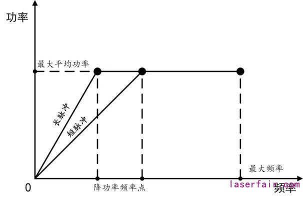 (1)激光器最大工作頻率(fmax)以下,降功率頻率點(f0)以上,激光器可以工作在最大平均功率(Pmax),此段輸出的脈沖能量(E)等于Pmax/f,頻率越高,單脈沖能量越低。