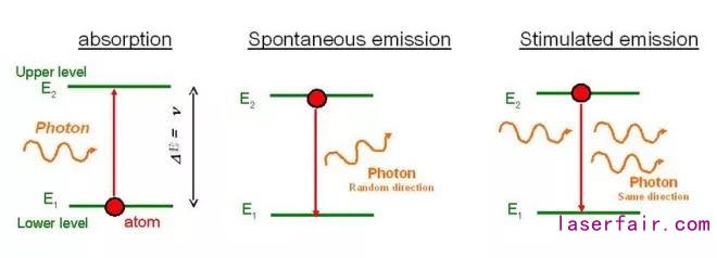 圖1 激光受激吸收、自發(fā)輻射與受激發(fā)射過程