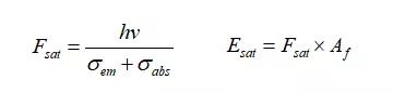 如圖1所示,除了泵浦受激吸收和信號受激發(fā)射,激發(fā)態(tài)的離子還會通過自發(fā)輻射不斷損耗,因此儲能不可能無限增加,限制通光方向橫截面儲能密度的物理量稱為飽和通量(Fsat),主要由信號激光頻率(v)位置的吸收截面( σabs)和發(fā)射截面(σem)決定。飽和通量與光纖通光面積(Af)的乘積即為飽和能量(Esat)。物理上Esat是使激光增益下降到小信號增益的1/e(~37%)時對應(yīng)的輸入脈沖能量。