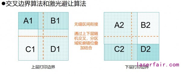 多激光多振鏡設(shè)備的核心重點(diǎn)之一,是多束激光并發(fā)工作。傾向提高打印效率為目標(biāo)的設(shè)備和傾向打印大幅面尺寸為目標(biāo)的設(shè)備,在路徑規(guī)劃掃描控制重點(diǎn)不一樣。前者對(duì)軟件算法要求更高。