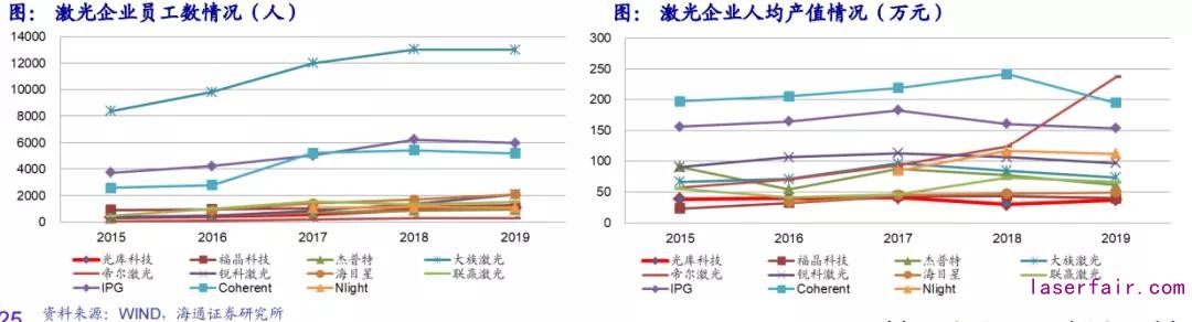 員工數(shù)上國(guó)內(nèi)企業(yè)持續(xù)上行,但18-19年海外企業(yè)員工數(shù)呈下降趨勢(shì),IPG【6220人->5960人】,Coherent【5418人->5184人】,Nlight【1130人->1100人】等。人均產(chǎn)值來(lái)看,行業(yè)19年整體呈現(xiàn)下降趨勢(shì),我們認(rèn)為這也跟行業(yè)降價(jià)等因素相關(guān),伴隨20年行業(yè)收入增速上行,后續(xù)提升可期。