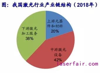 激光產(chǎn)業(yè)鏈包括上游元器件和材料、中游激光設(shè)備,下游激光加工服務(wù)。根據(jù)前瞻產(chǎn)業(yè)研究院,激光加工設(shè)備市場(chǎng)占據(jù)激光市場(chǎng)最大市場(chǎng)份額,占激光產(chǎn)業(yè)鏈?zhǔn)袌?chǎng)的42%。