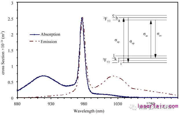 目前摻鐿光纖激光器主要的泵浦波長有三種,即915nm、976nm和1018nm,其中前兩種主要在工業(yè)產(chǎn)品中使用,最后一種則用于超高單纖功率科研產(chǎn)品中。摻鐿光纖激光器的泵浦波長的選擇主要是由摻鐿光纖(YDF)的吸收發(fā)射譜所決定的,如圖1所示。