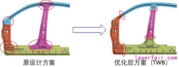 ⑴原方案:4個零件是單獨成形,后續(xù)通過點焊裝配;優(yōu)化方案:采用激光拼焊整體成形。