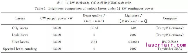 表1為12kW 連續(xù)輸出功率下,基于光譜合束的半導(dǎo)體激光器與其他商用激光器的亮度對(duì)比,可以看出,半導(dǎo) 體 激 光 器 超 過 了 CO2激光 器、達(dá) 到 了Disk 激 光 器 的 水 平。同 時(shí) 光 譜 合 束 也 將 芯 徑100μm光纖耦合 半 導(dǎo) 體 激 光 源 的 功 率 提 升 到 萬 瓦量級(jí),相對(duì)于常規(guī)合束技術(shù),其功率和亮度提升了近2個(gè)數(shù)量級(jí)。