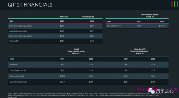 截至 2021 年 3 月 31 日,Luminar 賬上的現(xiàn)金及現(xiàn)金等價(jià)物有 6.103 億美元,而截至 2020 年 12 月 31 日,這個(gè)數(shù)據(jù)指標(biāo)是 4.857 億美元。