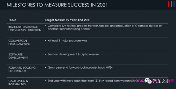 事實(shí)上,在今年 3 月舉行的 2020 年度業(yè)績(jī)電話溝通會(huì)上,Luminar 給自己的 2021 年立下了 5 大目標(biāo),如果悉數(shù)完成,那 2021 年就算是成功的。