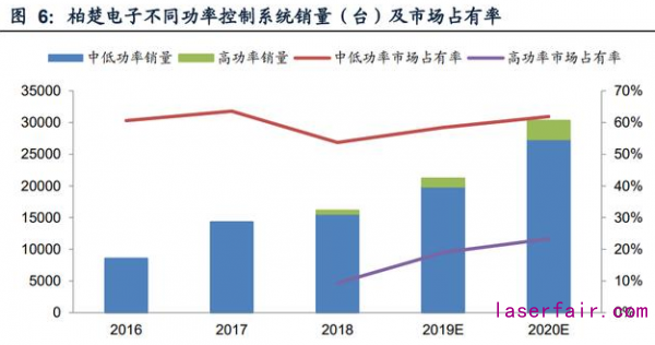 在數(shù)控系統(tǒng)領(lǐng)域,柏楚電子市占率國(guó)內(nèi)企業(yè)第一。在中低功率市場(chǎng)領(lǐng)域,國(guó)產(chǎn)激光運(yùn)動(dòng)控制系統(tǒng)已占據(jù)主導(dǎo)地位,而柏楚電子在中低功率市占率60%, 其產(chǎn)品在穩(wěn)定性、可靠性、精度、速度、易用性等方面占優(yōu)。在高功率激光切割系 統(tǒng)控制領(lǐng)域,國(guó)際廠商占據(jù)優(yōu)勢(shì),主要知名企業(yè)包括德國(guó)倍福、德國(guó)PA、西門(mén)子等, 柏楚高功率產(chǎn)品的技術(shù)指標(biāo)和使用性能為國(guó)內(nèi)領(lǐng)先水平。18年公司在國(guó)內(nèi)高功率激 光切割控制系統(tǒng)領(lǐng)域的市場(chǎng)占有率約9%??紤]到19年和20年公司總線系統(tǒng)銷(xiāo)售數(shù)量 分別增長(zhǎng)319%和212%,我們預(yù)計(jì)公司20年高功率系統(tǒng)市占率有望超過(guò)20%。